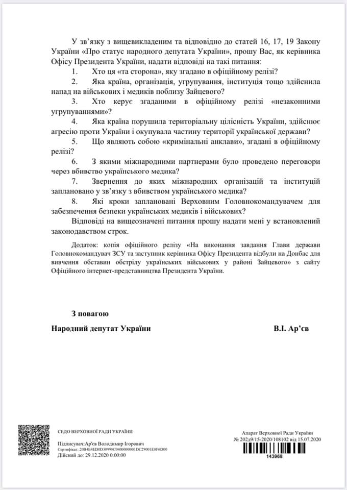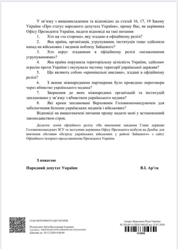 В частности, в обращении Арьев просит объяснить, что имеется в виду в офисе президента, когда там пишут в пресс-релизах «та сторона», кто управляет «незаконными группировками» на Донбассе и о которых «криминальных анклавах» говорится в релизах.