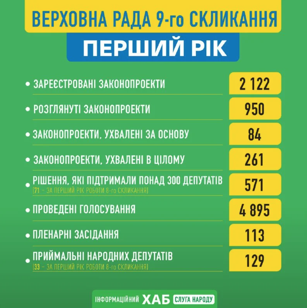 Напомним, Комитет избирателей подсчитал, что если в прошлом году в среднем за закон «слуги» отдавали 228 голосов, то в этом году — 214. В частности, за открытие рынка земли «слуги народа» отдали 206 голосов, за закон о банках — 200, за новую программу правительства Шмыгаля — 176 голосов.