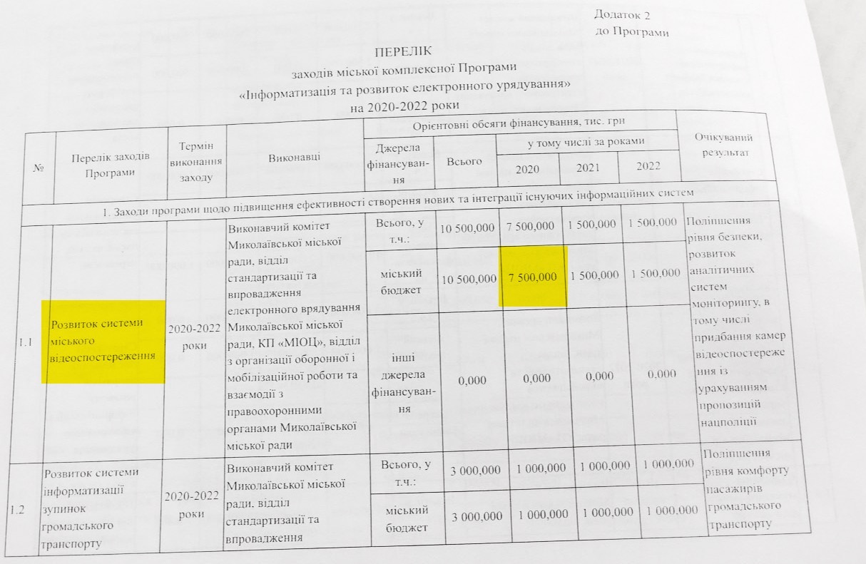 Ранее общий объем финансирования этой программы составлял около 87 миллионов гривен. Обновленная программа, рассчитана на 3 года, предусматривает общее финансирование в размере 94,3 миллионов гривен. Вместо 1,5 миллиона гривен на камеры, в этой программе теперь предлагается выделить в этом году 7,5 миллионов гривен.