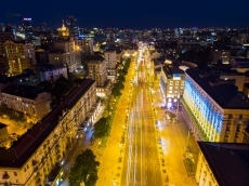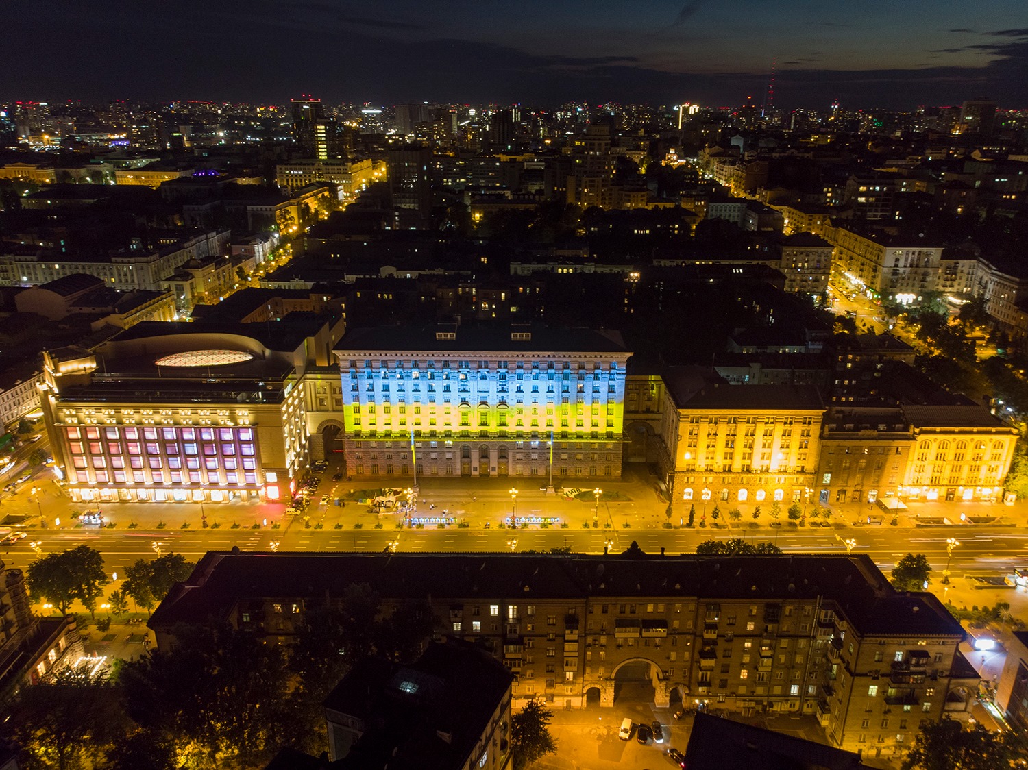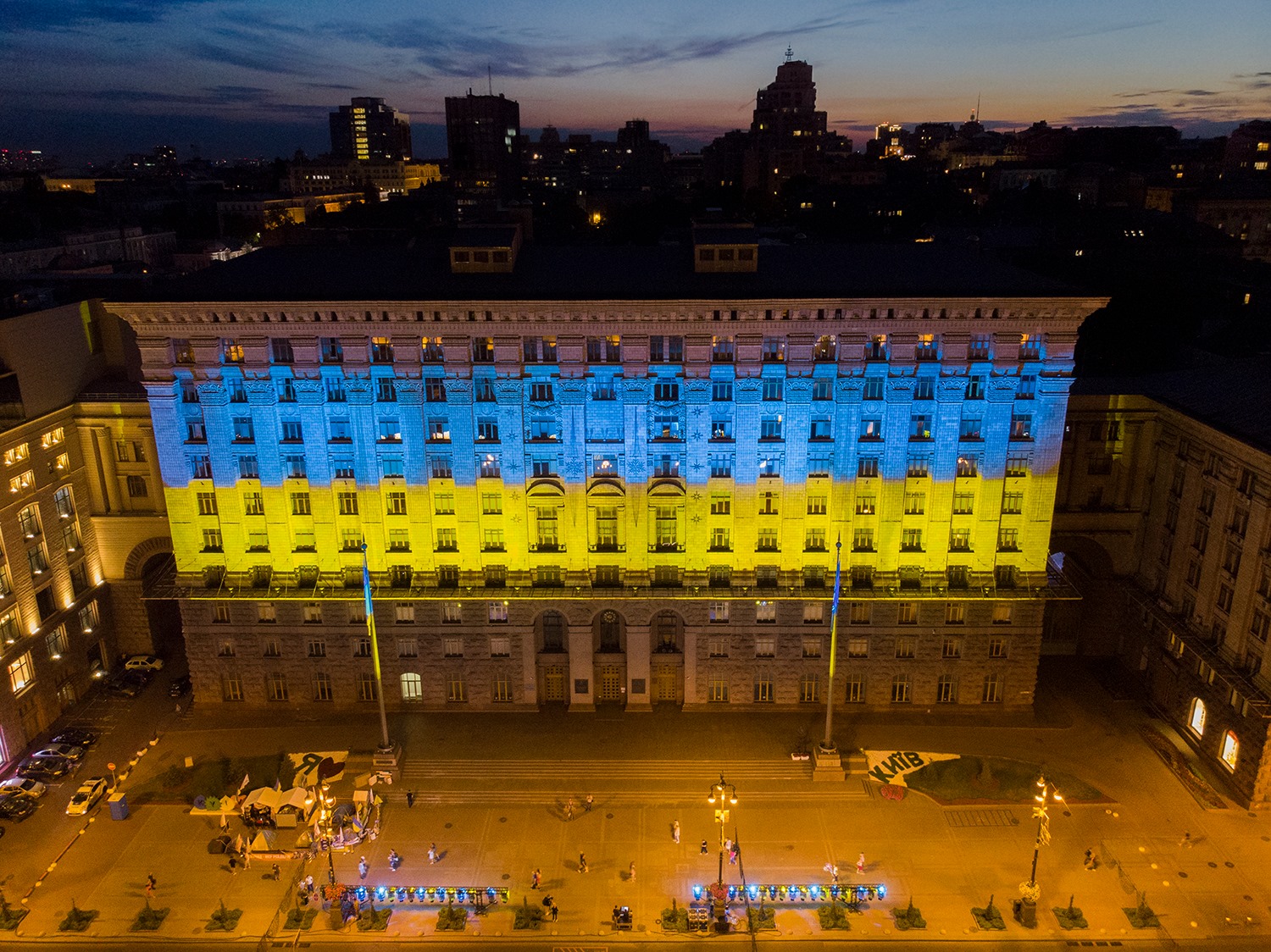 По случаю тридцатой годовщины поднятия украинского национального флага над столицей здание Киевской городской государственной администрации подсветили сине-желтыми цветами.
