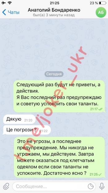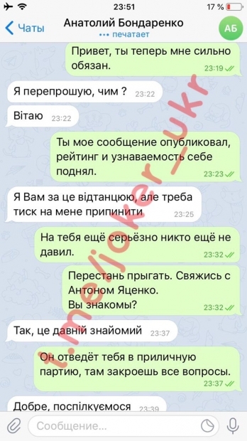Также отметим, что в в Telegram-канале «Джокер» была опубликована переписка пранкера с самим Анатолием Бондаренко. В переписке «Джокер» якобы дает указание мэру Черкасс встретиться с нардепом, который входит в депутатское объединение «За Майбутнє» в Верховной Раде Антоном Яценко, который в свою очередь должен привести его в «нормальную партию».
