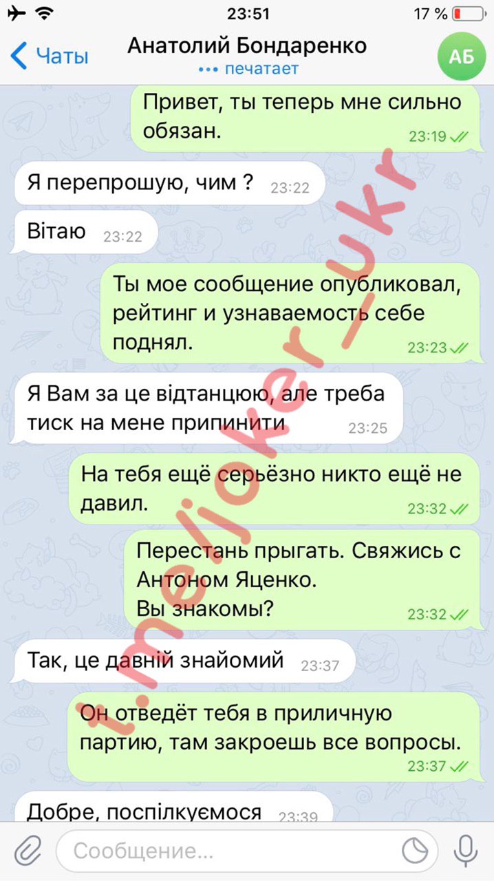 — Друзья, помните скандал с мэром Черкасс, который опубликовал переписку, где я ему угрожал от имени замглавы Офиса Трофимова? Тогда Бондаренко опубликовал этот скрин и получил народную поддержку. После Анатолий Бондаренко стал главным оппозиционером к президенту, начал наращивать рейтинг. Чуть позже я продолжил наш с ним диалог. И не ошибся. Устроил его в приличную партию всем известного олигарха. На поверку, мэр оказался пустышкой. Кидался на президента, чтобы с выгодой для себя порешать личные вопросы. Для любой политической силы такой кандидат — акробат, как Анатолий Бондаренко, больше репутационная потеря чем находка, — пишет «Джокер».