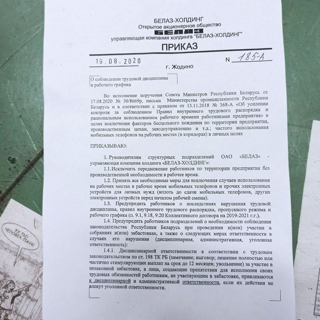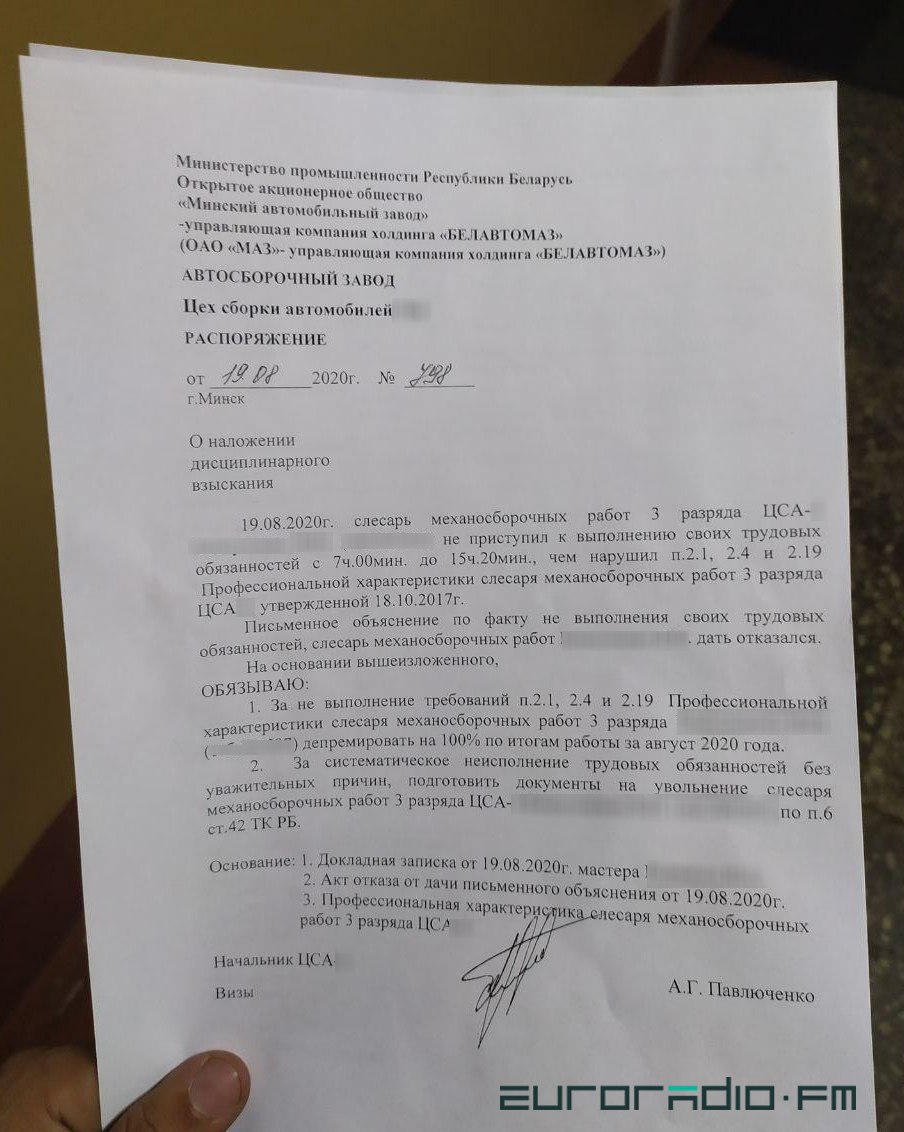 Как пишет «Новое время», первым появилось распоряжение об увольнении слесаря механосборочных работ автосборочного цеха МАЗ, который не вышел на смену.