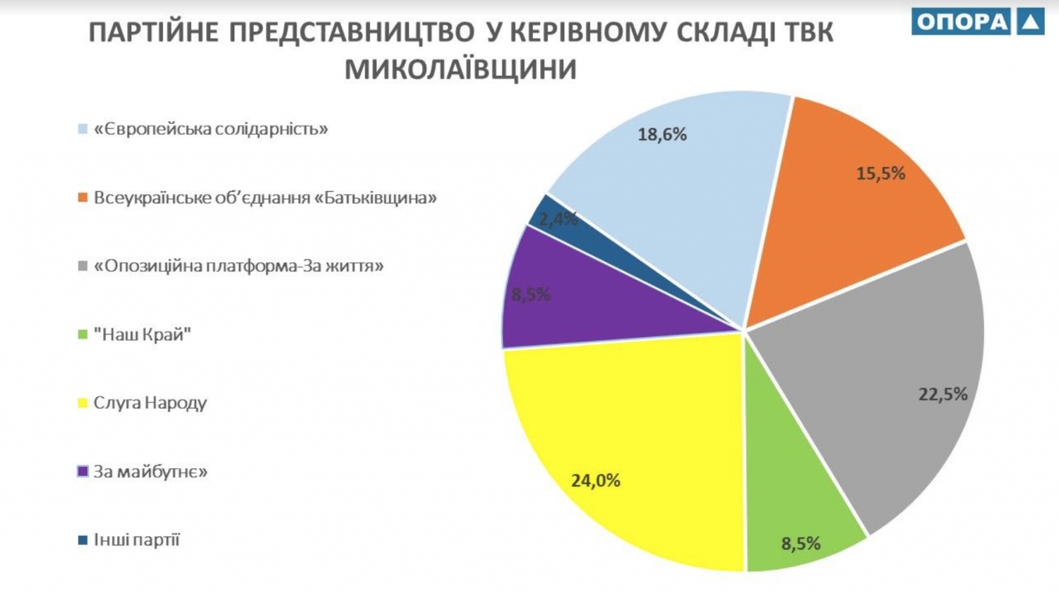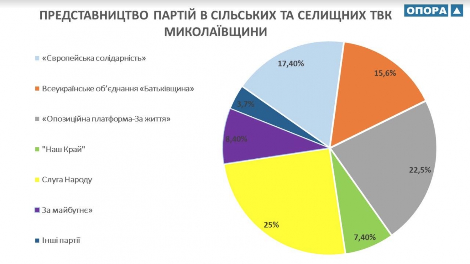 В общем представительство в избирательных комиссиях имеют 10 политических партий. Наибольшее представительство в сельских и поселковых избирательных комиссиях Николаевской области имеют шесть партий: «Слуга народа» — 25% от общего количества представленных партий, «Оппозиционная платформа — За жизнь» — 22,5%, «Европейская Солидарность» — 17,4%, «Батьківщина» — 15,6%, «За Майбутнє» — 8,4%, «Наш край» — 7,4%.