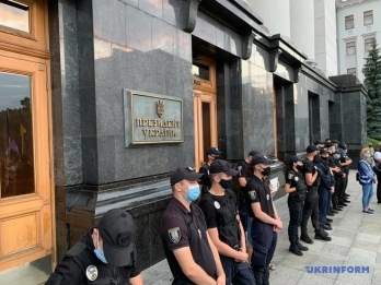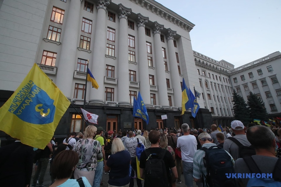 Как сообщает корреспондент Укринформа, под ОПУ мероприятие проходит спокойно, люди стоят, держа в руках флаги Украины.