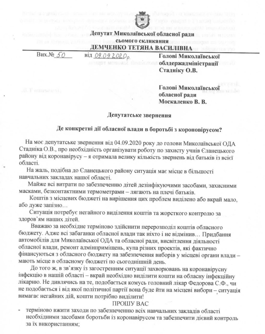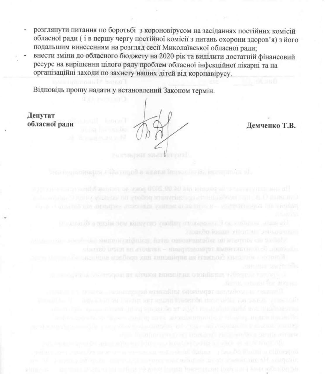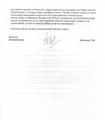 В связи с этим, депутат просит принять меры по обеспечению учебных заведений всем необходимым для работы в условиях коронавируса, а также рассмотреть вопрос по борьбе с коронавирусом на заседаниях депутатских комиссий областного совета с дальнейшим вынесением на рассмотрение сессии Николаевского облсовета. Внести изменения в областной бюджет на 2020 год и выделить достаточный финансовый ресурс на решение целого ряда проблем областной инфекционной больнице и на организационные мероприятия по защите наших детей от коронавируса.