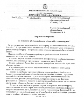 Депутат Николаевского областного совета Татьяна Демченко обратилась к председателю Николаевской облгосадминистрации Александру Стаднику и главе облсовета Виктории Москаленко с просьбой обеспечить учебные заведения области средствами защиты от коронавирусного заболевания COVID-19.