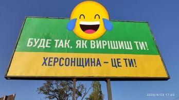 Так, борд выполнен в типичной стилистике партии «Слуга народа» и на нем размещены слоганы политсилы: «Буде так, як вирішиш ти!» и «Херсонщина — це ти!».