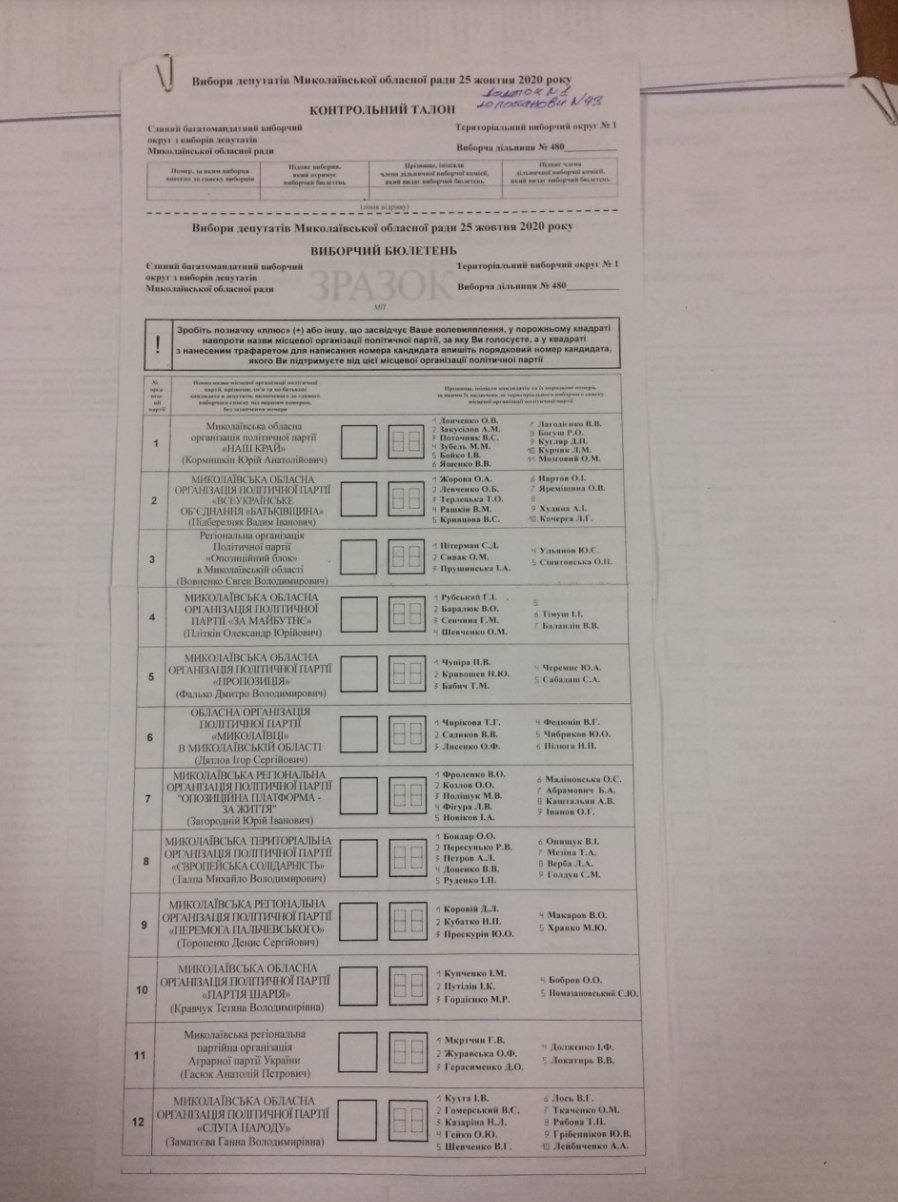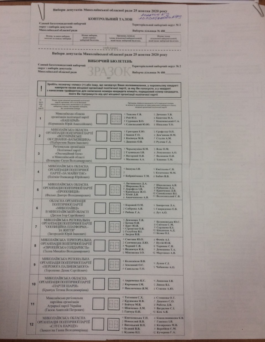 Областная избирательная комиссия утвердила текст бюллетеней для голосования в соответствующих территориальных избирательных округах единого многомандатного избирательного округа по выборам депутатов Николаевского областного совета на местных выборах 25 октября 2020 года.