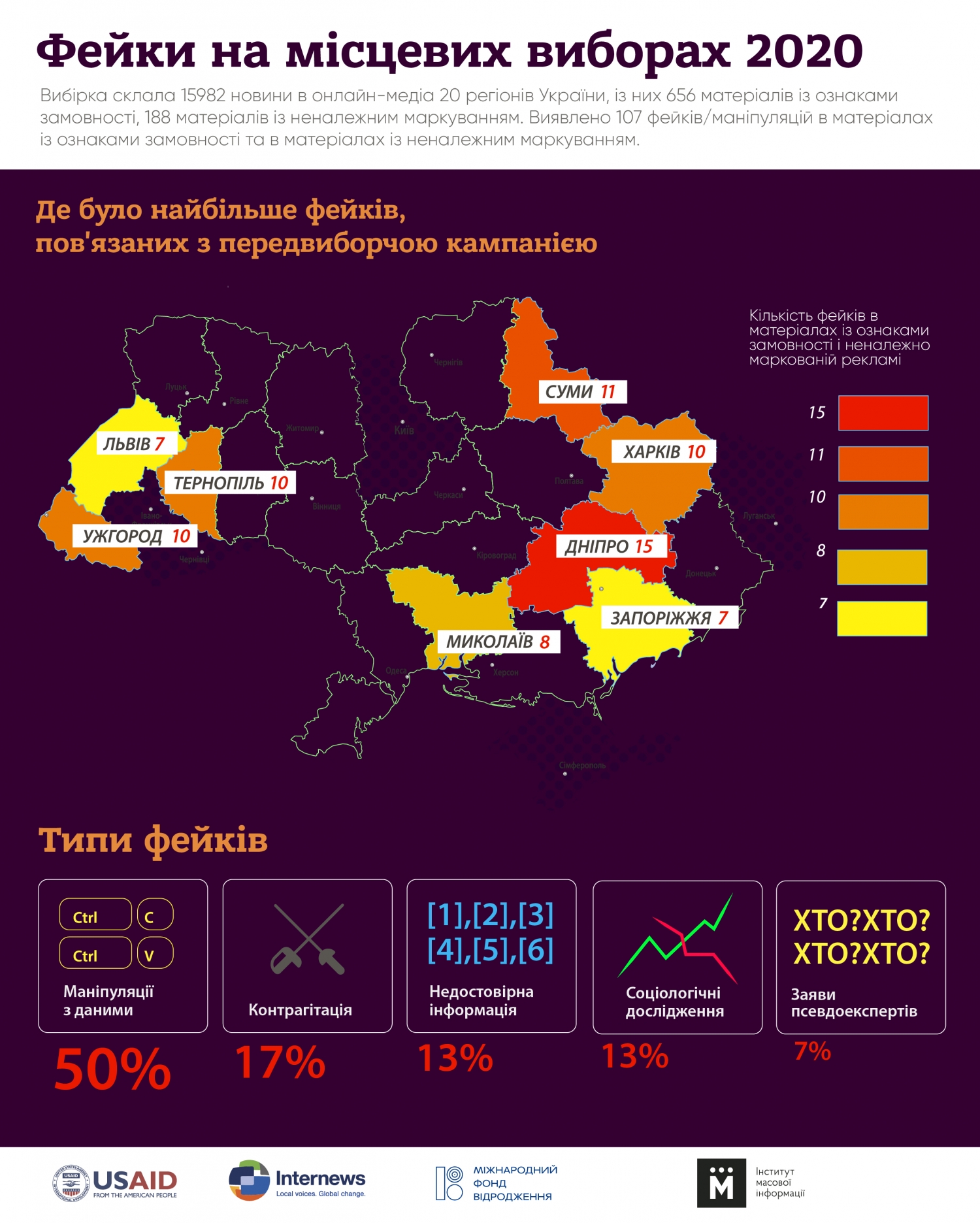 По результатам исследования, 13% политических материалов с признаками заказа содержали фейки и манипуляции. Наибольшее количество фейков и манипуляций было зафиксировано в онлайн-медиа Днепра (15 фейков и манипуляций), Сум (11 фейков и манипуляций), Ужгорода, Тернополя, Харькова (по 10 фейков/манипуляций), Николаева (8 фейков/манипуляций), Запорожье и Львова (по 7 фейков/манипуляций). При этом, 50% выявленных фейков касались искаженных цифр и данных. Еще 17% пришлись на недостоверной контрагитацим и «черного пиара». 13% содержали недостоверную информацию и оценки, не соответствующие действительности. Столько же, 13%, пришлись на манипуляции с социологическими исследованиями и 7% составили манипулятивные заявления «псевдоэкспертов».