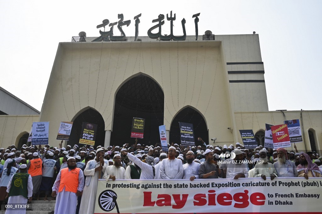 Протестующие устроили марш по улицам столицы Бангладеш Дакки и скандировали: «Бойкот французской продукции». Некоторые из них несли транспаранты с портретом Макрона и подписью «самый большой террорист мира».