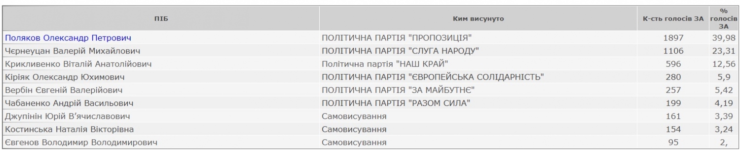 Александр Поляков набрал 1897 голосов избирателей, то есть 39,98%. На втором месте кандидат от партии «Слуга народа» Валерий Чернеуцан с результатом 23,31%. 12,56% кандидат от «Нашего края» Виталий Крикливенко.