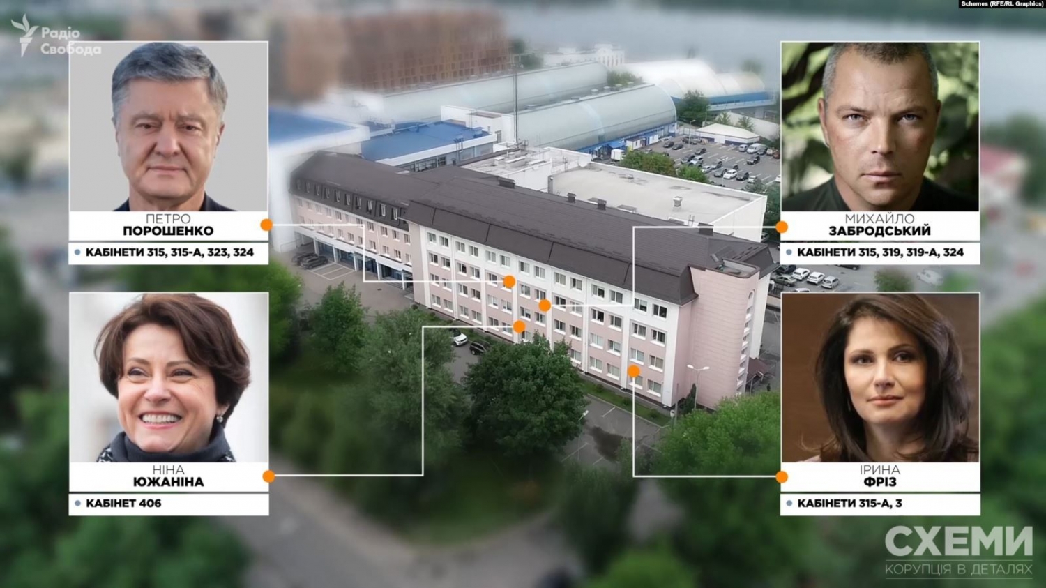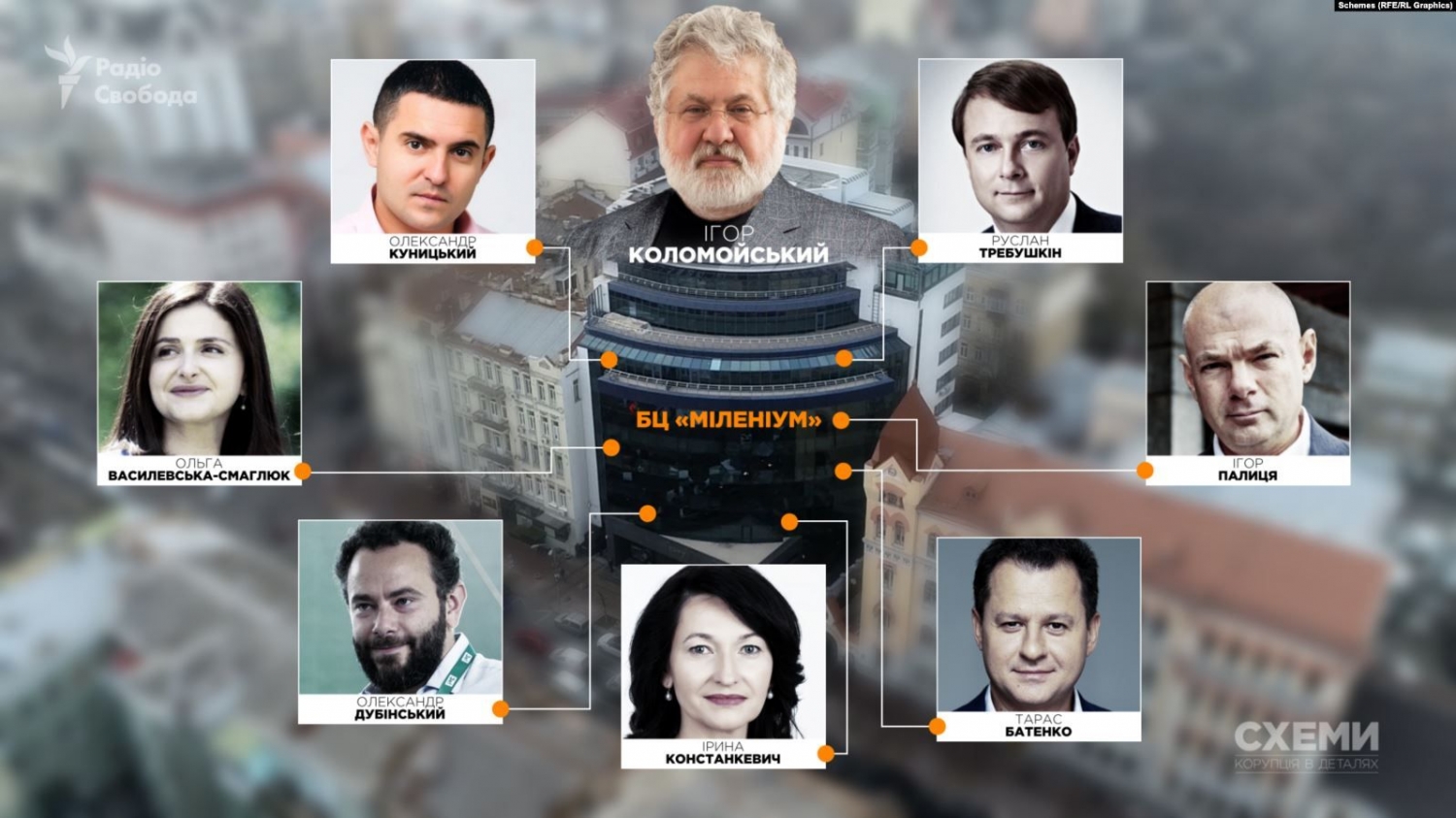 Так, по адресу Киев, Владимирская, 12 находятся приемные Ольги Василевской-Смаглюк (экс-журналистка канала «1+1», который принадлежит Коломойскому), Александра Куницкого (ZP Санек), Александра Дубинского (также работал на «1+1»), Руслана Требушкина (внефракционный), Ирины Констанкевич и Тараса Батенко (оба из группы «За майбутнє»). Также есть приемная в этом центре у лидера «За майбутнє» Игоря Палицы, давнего партнера Коломойского.