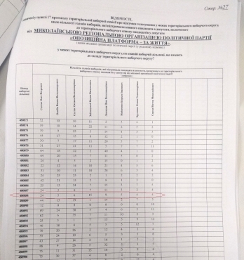В частности, «ОПОРА» получила получила копию протокола Николаевской городской ТИК об итогах голосования по выборам депутатов облсовета в пределах избирательного округа №7 и сравнила его с протоколом о подсчете голосов на избирательных участках № 480888 и 480916, на которых во время подсчета голосов присутствовали наблюдатели «ОПОРЫ». Оказалось, что количество голосов, которые по данным протокола городской ТИК получили шесть кандидатов, не совпадает с количеством голосов, указанных в протоколах двух УИК.