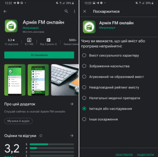 Работники радио призвали пользователей зайти в магазин приложений и пожаловаться на фейк (пункт «Имитация или подражание»).