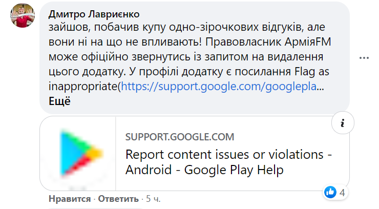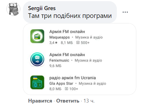 В комментариях под постом «Армия FM» пользователи начали массово сообщать о том, что такое приложение не одно, а реакции от Google Play Market на многочисленные жалобы и оценки «1 звезда» нет. Радио, как правообладателю, советуют лично направить жалобу.
