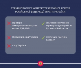 Как сообщили в управлении стратегических коммуникаций аппарата, термины «территории самопровозглашенных/так называемых ДНР/ЛНР», «Юго-восток Украины» и «Восток Украины», которые часто используют в СМИ и социальных сетях, являются ошибочными.