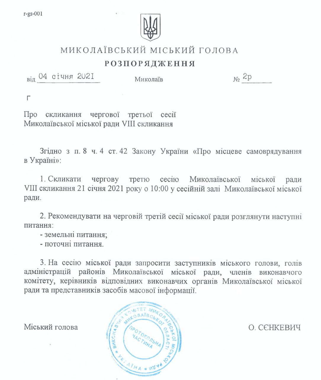 Третья очередная сессия Николаевского городского совета назначена на 21 января. Соответствующее распоряжение, опубликованное на сайте горсовета, 4 января подписал мэр Николаева Александр Сенкевич.
