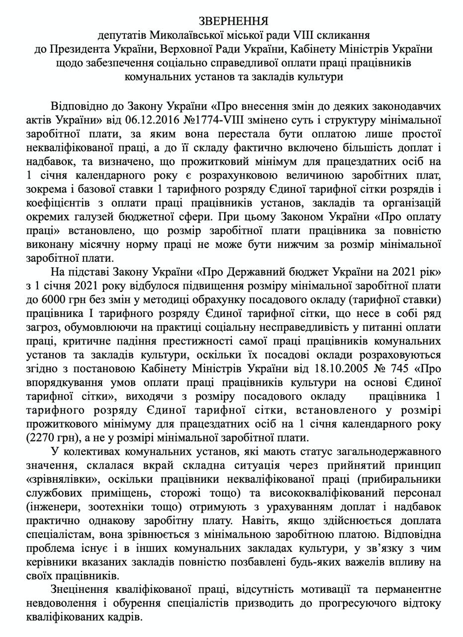 Это, говорится в обращении, несет в себе ряд угроз, обуславливая на практике социальную несправедливость в вопросе оплаты труда, критическое падение престижности самого труда работников коммунальных учреждения культуры, поскольку их должностные оклады рассчитываются согласно постановления Кабмина от 18 октября 2005 года №745 «Об упорядочении условий труда работников культуры на основе Единой тарифной сетки, исходя из размера должностного оклада работника I тарифного разряда Единой тарифной сетки, установленного в размере прожиточного минимума для трудоспособных лиц на 1 января календарного года (2270), а не в размере минимальной заработной платы».
