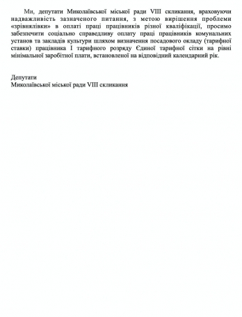 Депутаты Николаевского городского совета намерены обратиться к президенту Украины Владимиру Зеленскому, а также Верховной Раде и Кабинету министров в связи с ситуацией, сложившейся вокруг уровня заработных плат работников учреждений культуры, которые уравняли вне зависимости от должности и уровня квалификации сотрудников.