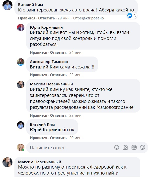 Глава Николаевской облгосадминистрации Виталий Ким отреагировал на пост Юрий Кормышкина. Он выразил сомнение в том, что автомобиль подожгли.