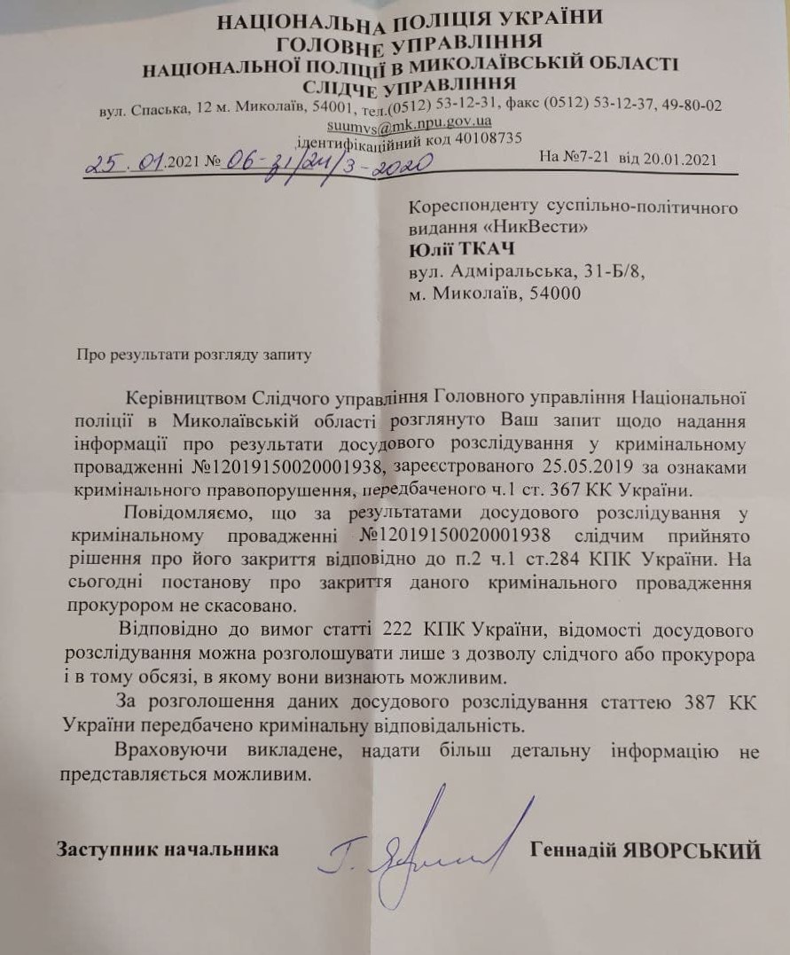 «Сообщаем, что по результатам досудебного расследования в уголовном производстве следователем принято решение о его закрытии», — говорится в ответе Следственного управления на запрос.