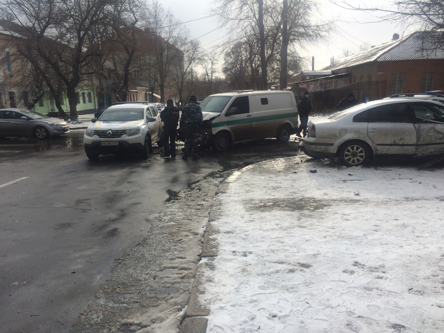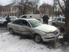 Сегодня, 12 февраля, в Николаеве на пересечении улиц Никольской и Шнеерсона столкнулись инкассаторский автомобиль Volkswagen Transporter и Volkswagen Passat.