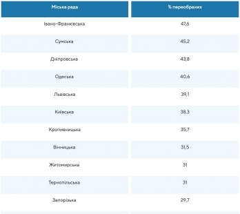 Самый высокий уровень «доверия» у депутатов городского совета Ивано-Франковска - 47,6% избранников предыдущего созыва. Немного ниже показатели в Сумском горсовете - 45,2%, Днепропетровского - 43,75% и Одесского - 40,6%.