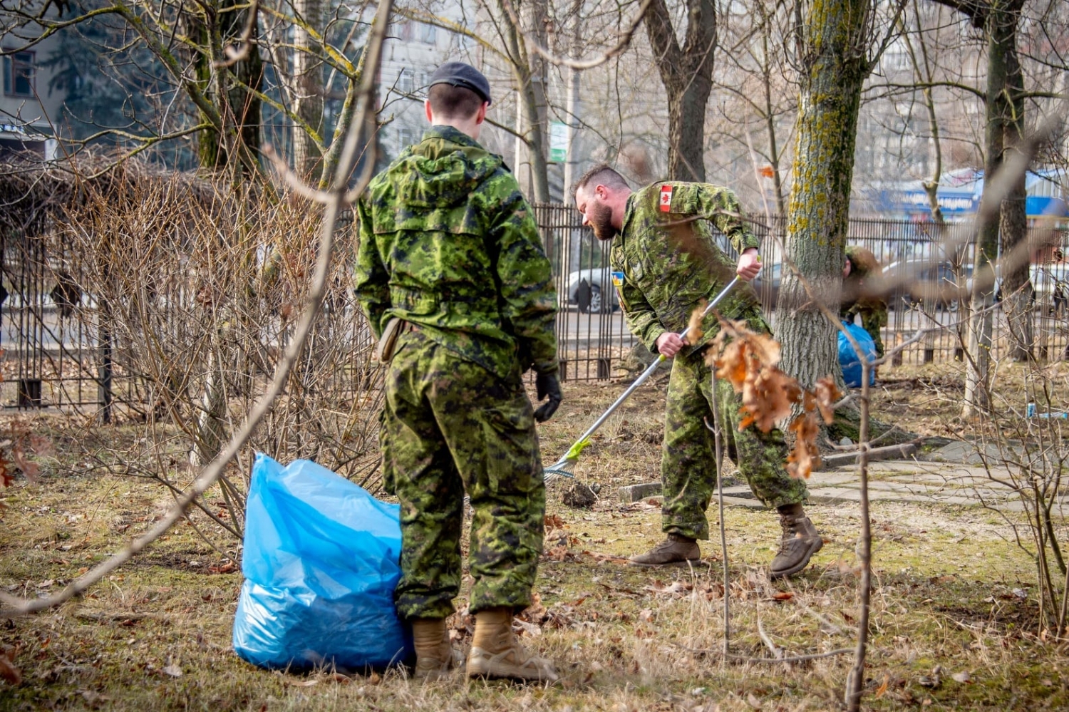 Инструкторы Вооруженных сил Канады из Группы советников коллективной подготовки Операции ЮНИФАЕР в Украине в свое свободное время приняли участие в весенней толоке на территории больницы для ветеранов войны в Николаеве.