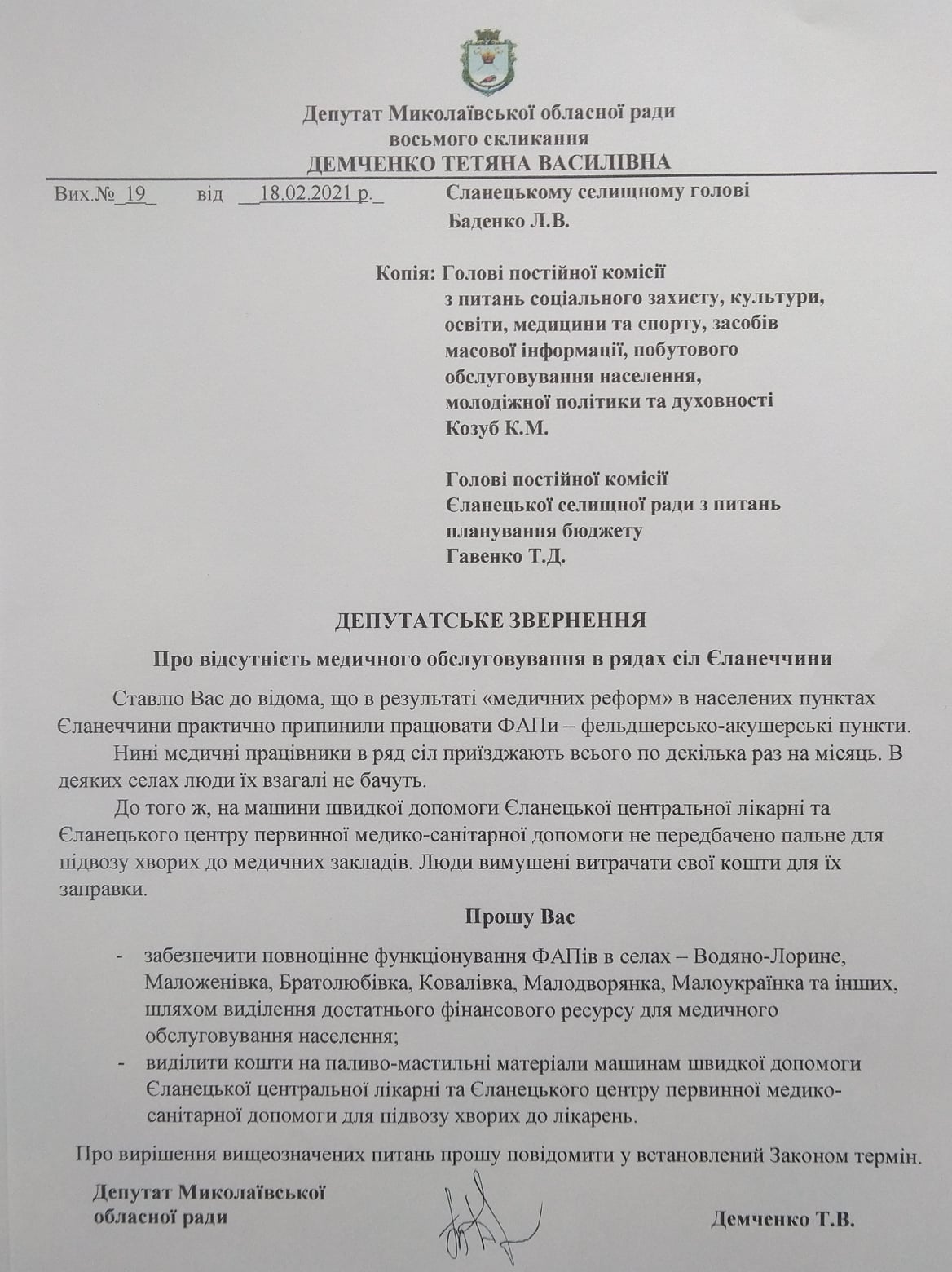 Депутат Николаевского областного совета Татьяна Демченко требует возобновить работу фельдшерско-акушерских пунктов (ФАПов) в селах Еланецкого района.