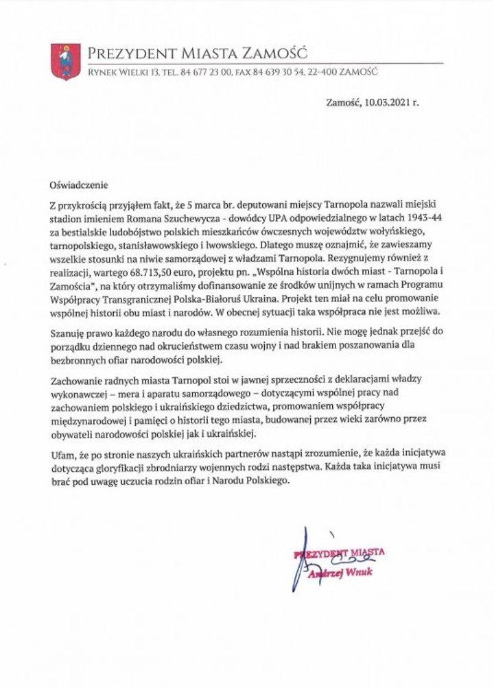 — С прискорбием констатируем тот факт, что 5 марта депутаты совета Тернополя назвали городской стадион именем Романа Шухевича — руководителя УПА, ответственного за зверские убийства польского населения в 1943-44 годах, — говорится в заявлении, которое опубликовал мэр Замостье Анджей Внук в среду 10 марта.
