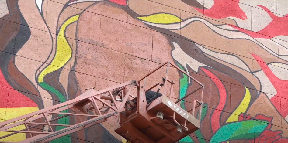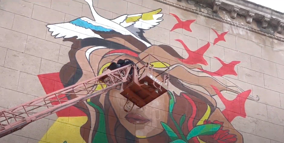 Представители «Национального корпуса» с помощью автовышки закрасили лицо мурала, нарисованного недавно на глухой стене многоэтажки по Соборной, 13 в Николаеве.