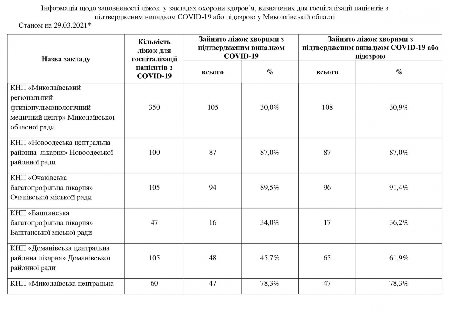 — роддом №1 Николаева - 24 больных, всего 100 коек (загруженость 24%);