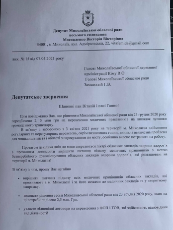 Депутат направила обращение к главе Николаевской ОГА Виталию Киму и главе облсовета Анне Замазеевой с требованием немедленно обеспечить подвоз врачей.