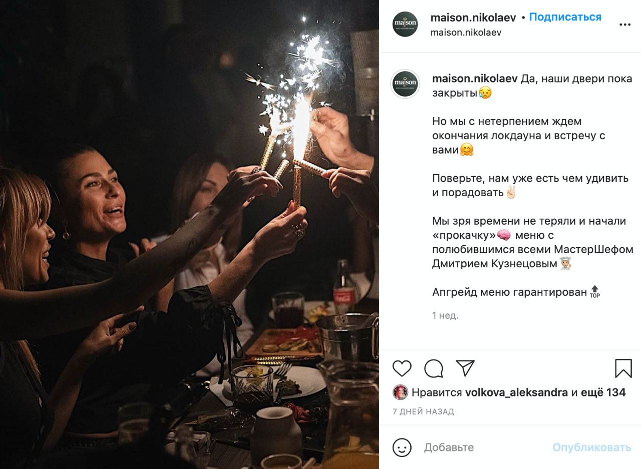 Отметим, что в Instagram ресторана нет ни одного упоминания о том, что заведение принимает посетителей. В своих публикациях «Maison» предлагает воспользоваться услугами доставки еды из ресторана. А в одной из публикаций от 13 апреля пишет, что двери ресторана «пока закрыты».