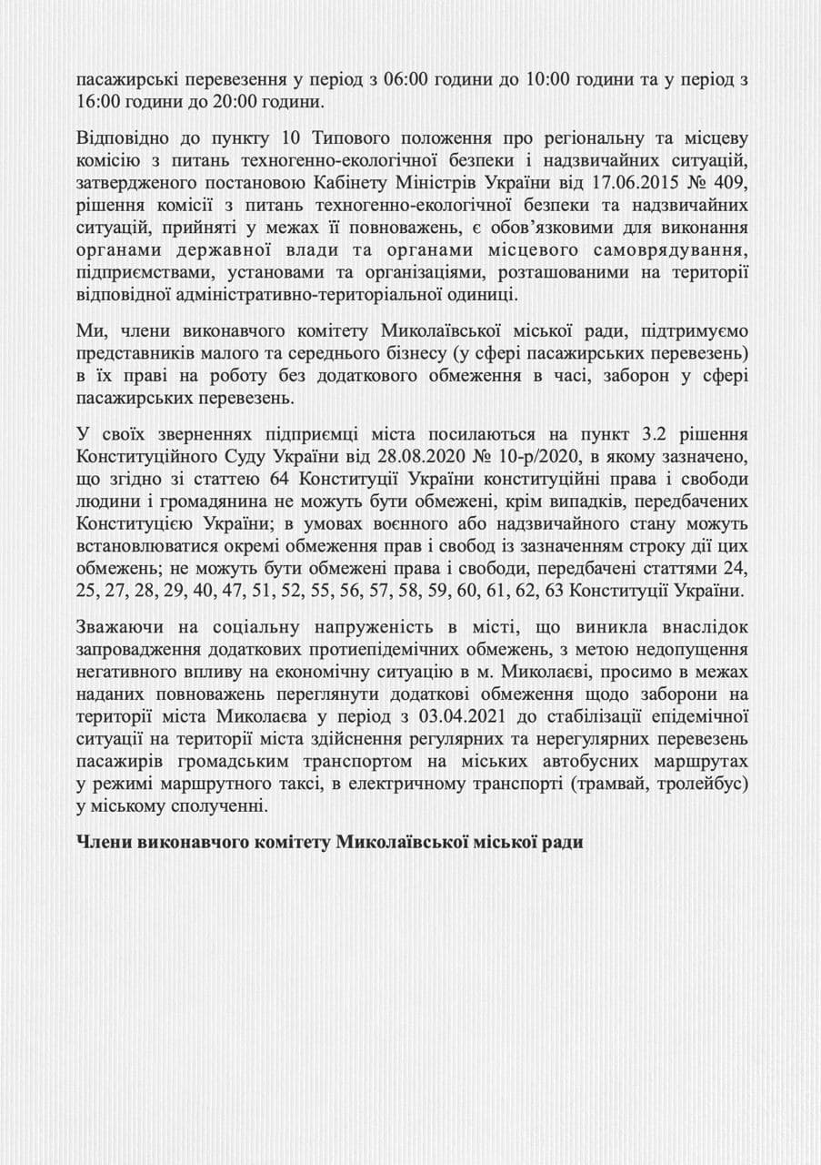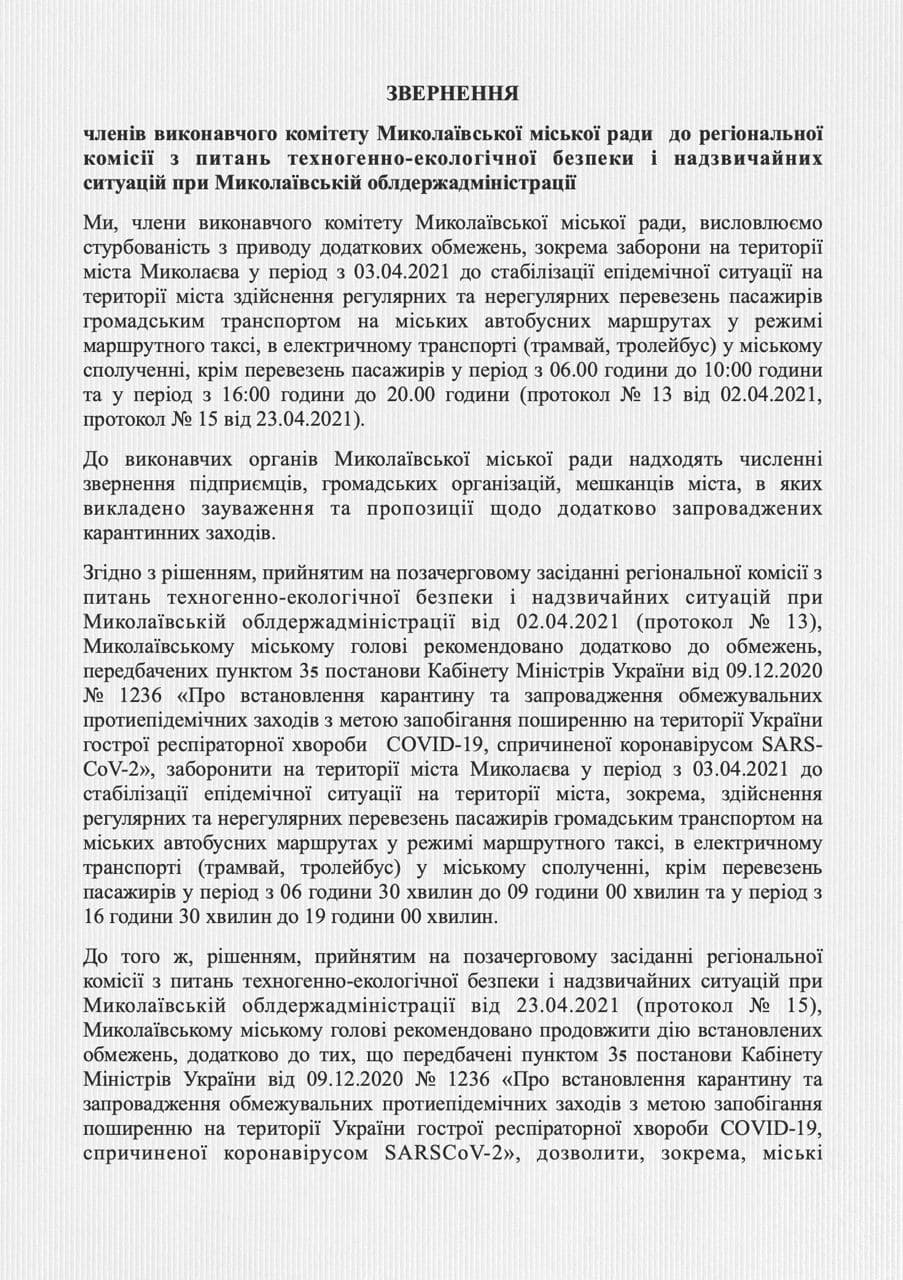 В мотивирующей части документа значится: «Учитывая социальную напряженность в городе, возникшую в результате введения дополнительных противоэпидемических ограничений, с целью недопущения негативного влияния на экономическую ситуацию в Николаеве, просим в пределах предоставленных полномочий пересмотреть дополнительные ограничения».
