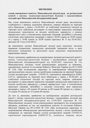 В понедельник, 26 апреля, исполком Николаевского городского совета обратился к региональной комиссии по вопросам техногенно-экологической безопасности и чрезвычайных ситуаций при Николаевской облгосадминистрации с просьбой пересмотреть ограничения в регулярных и нерегулярных перевозках пассажирским транспортом.