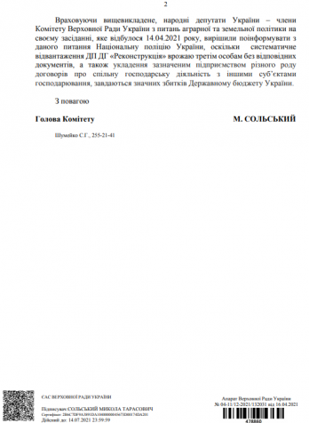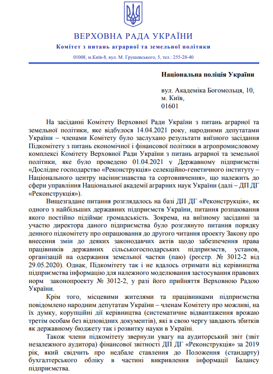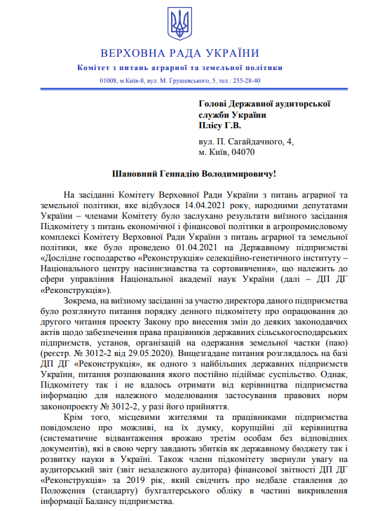 После визита нардепа Чорноморова: аграрный комитет ВР просит Госаудитслужбу и Нацполицию проверить ГП «Реконструкция» на Николаевщине