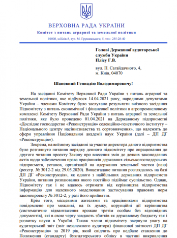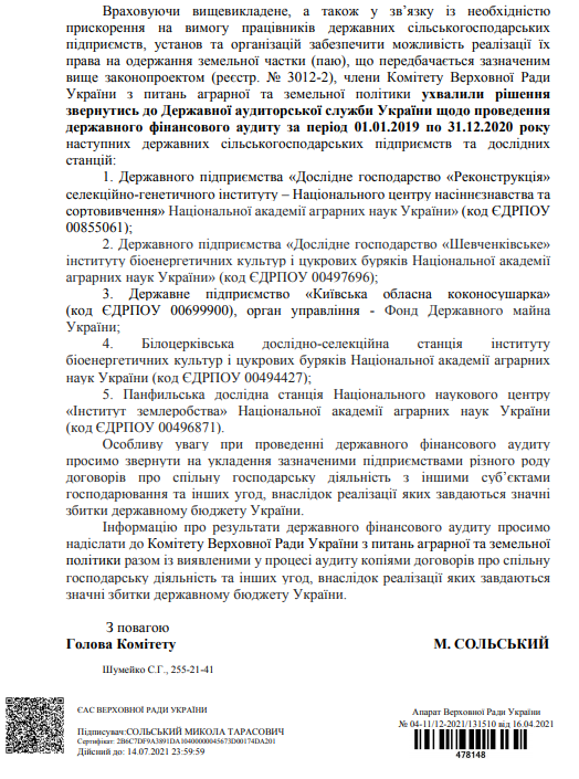 Комитет Верховной Рады Украины по вопросам аграрной и земельной политики просит Госаудитслужбу проверить следующие предприятия: