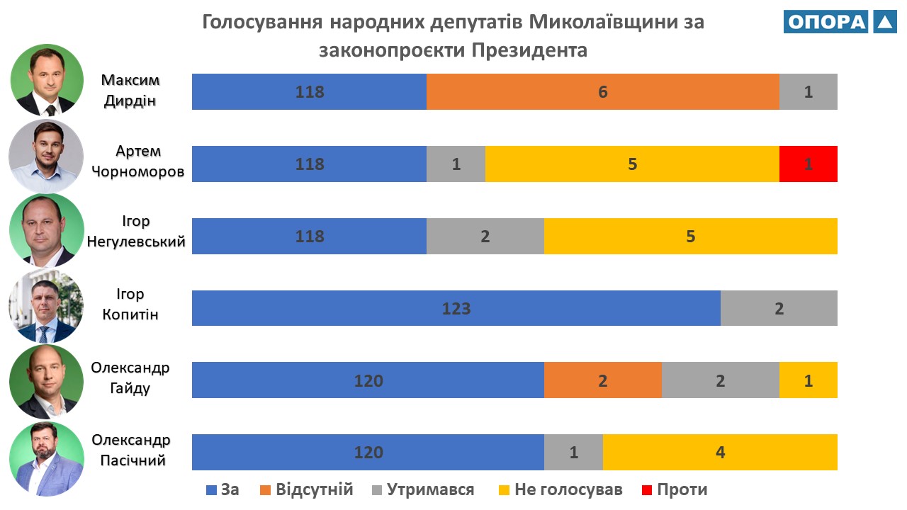 Среди мажоритарщиков больше всего поддерживал законопроекты Президента Игорь Копытин, который голосовал «за» в 123 случаях. По 120 голосований «за» имеют Александр Гайду и Александр Пасечный. И по 118 голосований «за» у Игоря Негулевського, Артема Черноморова и Максим Дырдина. Кроме того, народные депутаты почти не пропускали голосования в Верховной Раде, касающиеся законодательных инициатив Президента: шесть раз отсутствовал Максим Дырдин и два раза Александр Гайду. Единожды Артем Черноморов не поддержал президентский проект Закона Украины «О внесении изменений в Закон Украины «О судоустройстве и статусе судей» и некоторые законы Украины относительно деятельности Верховного Суда и органов судейского управления». 5 ноября 2020 года нардеп проголосовал «против».