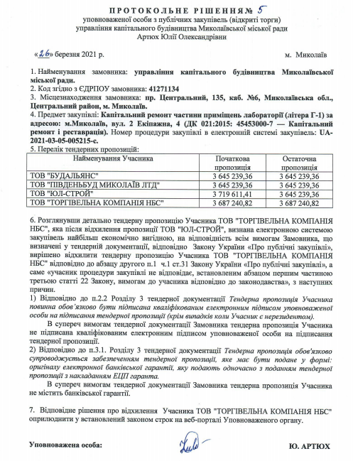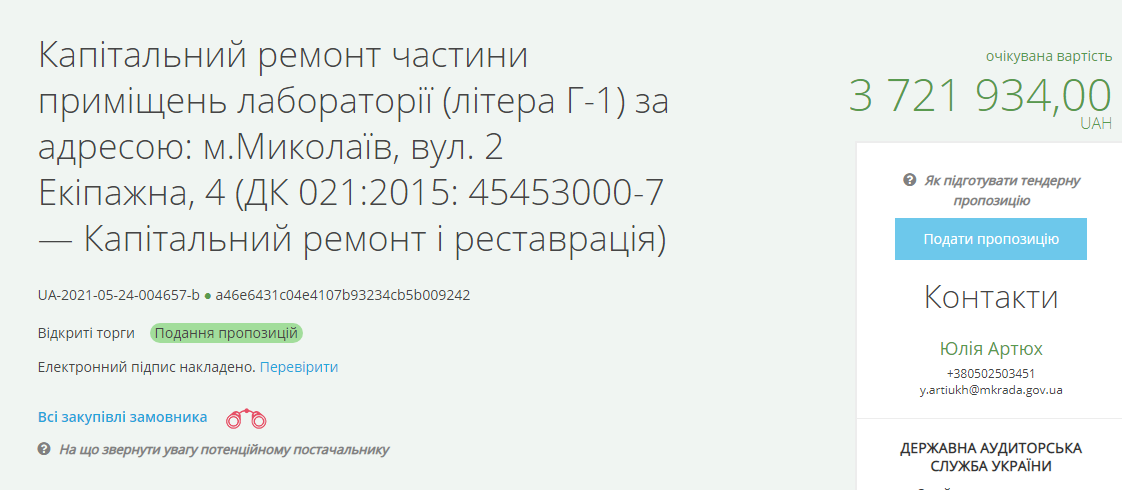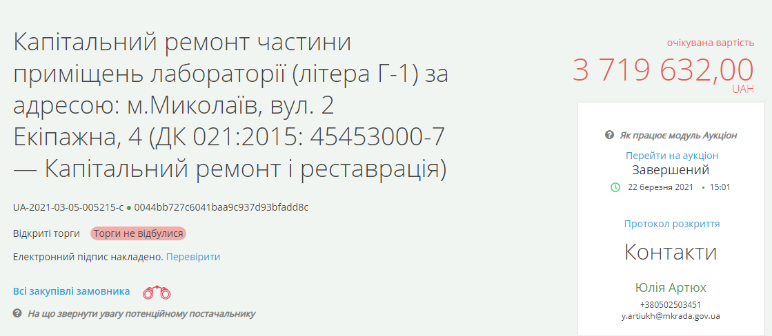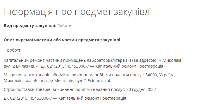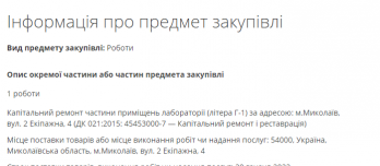 Управление капитального строительства Николаевского горсовета объявило повторный тендер на ремонт помещений лаборатории городской больницы №1, ожидаемая стоимость работ составляет 3 миллиона 721 тысячу 934 гривны.