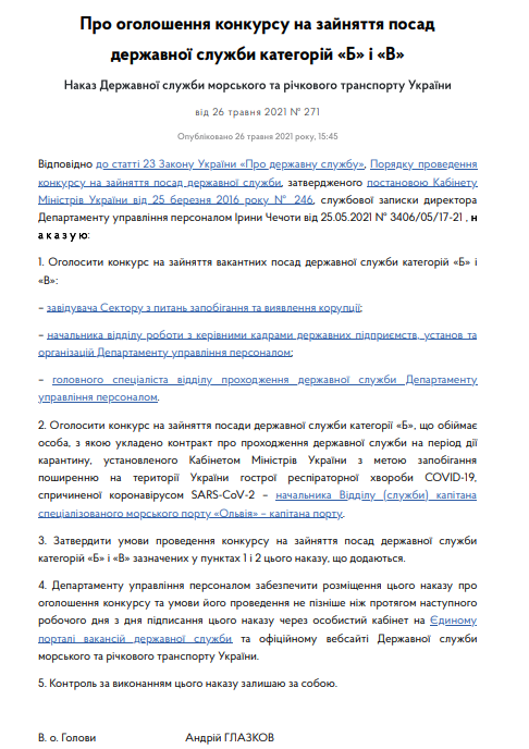 Морская администрация объявила кадровый конкурс на занятие вакантной должности государственной службы категории «Б»: начальника Отдела (службы) капитана — капитана Специализированного морского порта «Ольвия» в Николаеве.