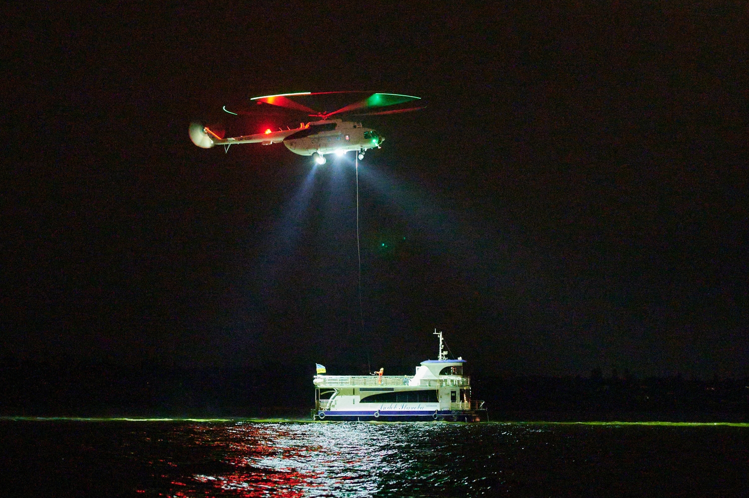 Глава правления авиакомпании «Украинские вертолеты» Владимир Ткаченко заявил, что в Украине впервые была проведена учебная тренировка по спасению пострадавших с водной поверхности ночью.