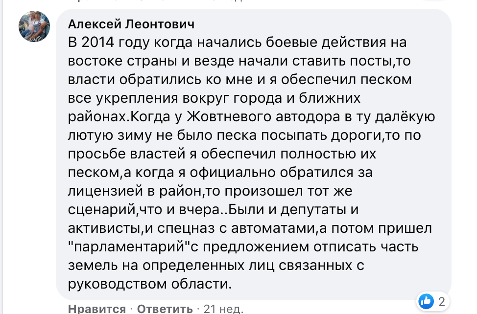 — В 2014 году когда начались боевые действия на востоке страны, и везде начали ставить посты, то власти обратились ко мне, и я обеспечил песком все укрепления вокруг города и ближних районах. Когда у Жовтневого автодора в ту далёкую лютую зиму не было песка посыпать дороги, то по просьбе властей я обеспечил полностью их песком, а когда я официально обратился за лицензией в район, то произошел тот же сценарий, что и вчера... Были и депутаты, и активисты, и спецназ с автоматами, а потом пришел «парламентарий» с предложением отписать часть земель на определенных лиц, связанных с руководством области, — писал предприниматель.