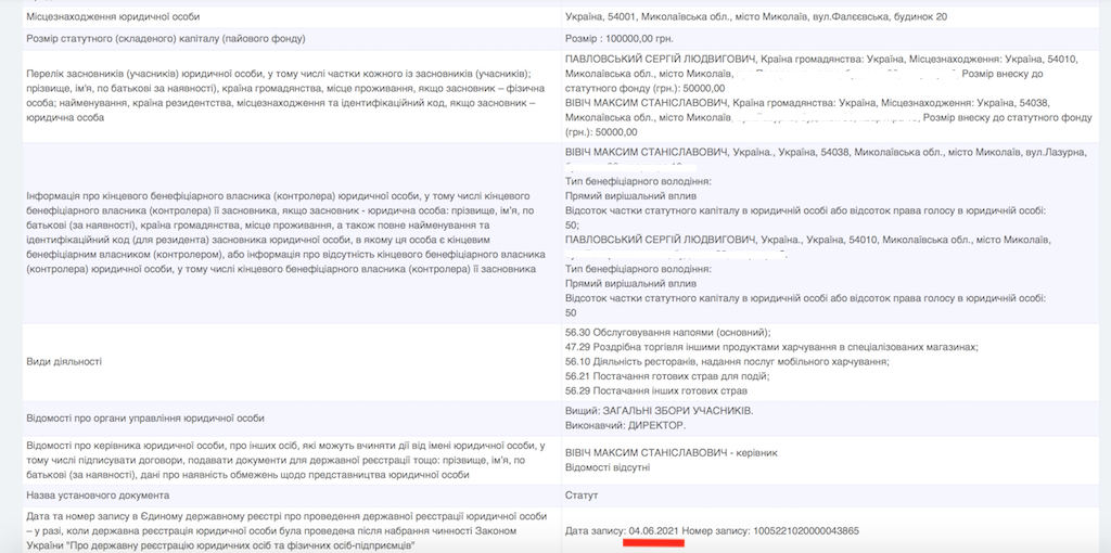 Отметим, что данное предприятие было зарегистрировано 6 июня этого года в Николаеве по улице Фалеевской. Его учредители — Сергей Павловский и Максим Вивич. Последний является также директором ООО.