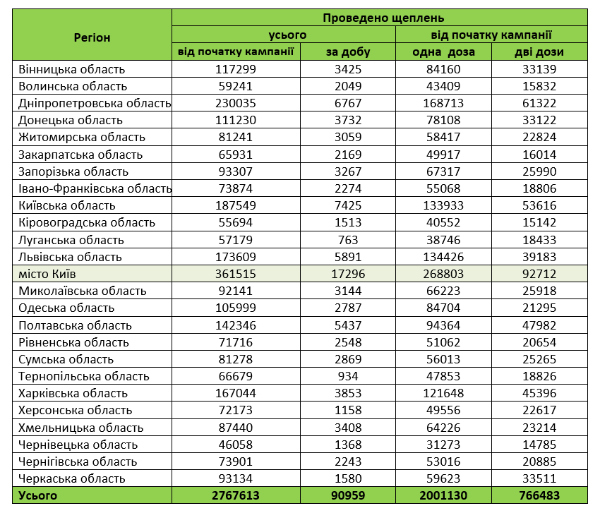 Наибольшее количество прививок сделали в Киеве 17296, наименьше в Луганской области — 763.
