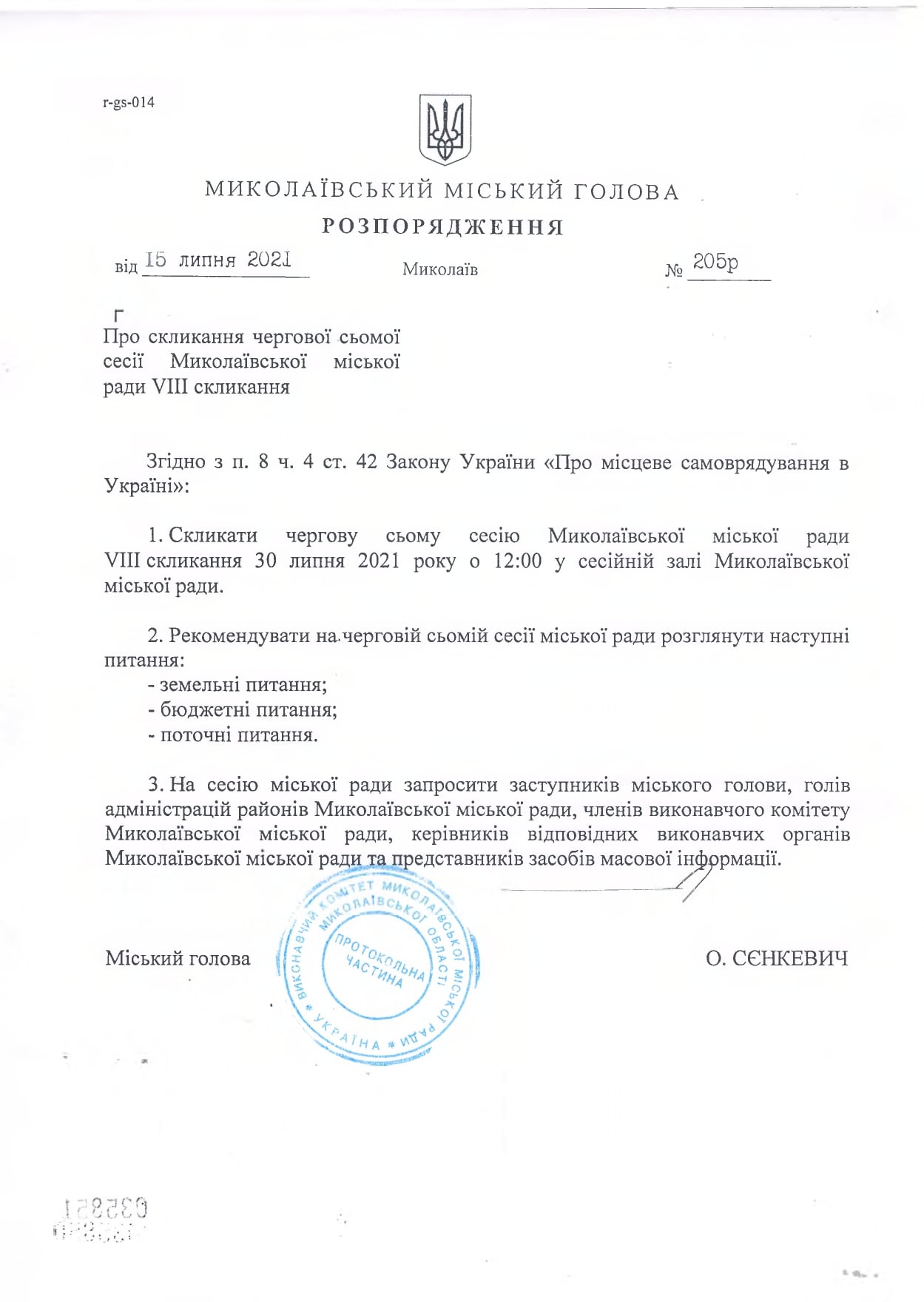 Распоряжение городского головы Александра Сенкевича №205р от 15 июля опубликовали на сайте горсовета.