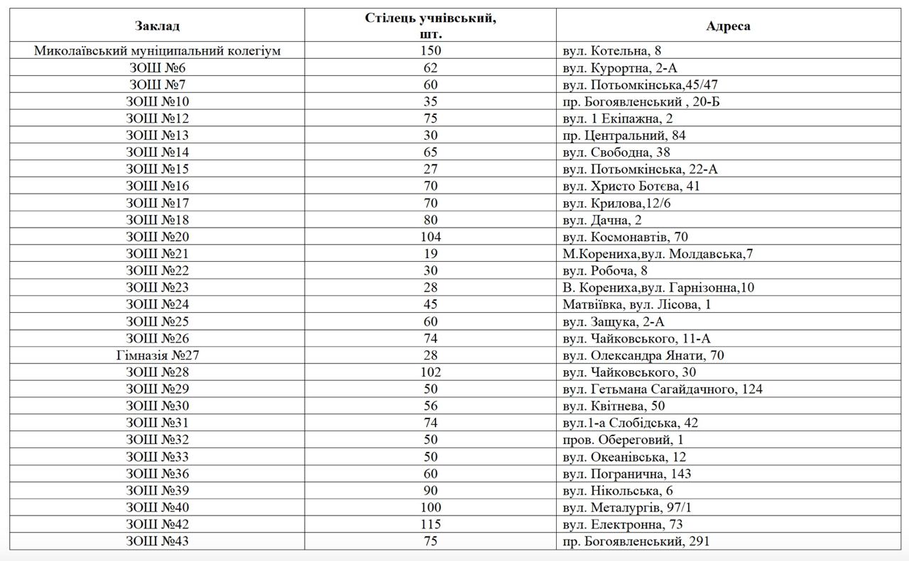 Гороно Николаева объявило тендер на покупку стульев и парт для НУШ за ₴6 млн
