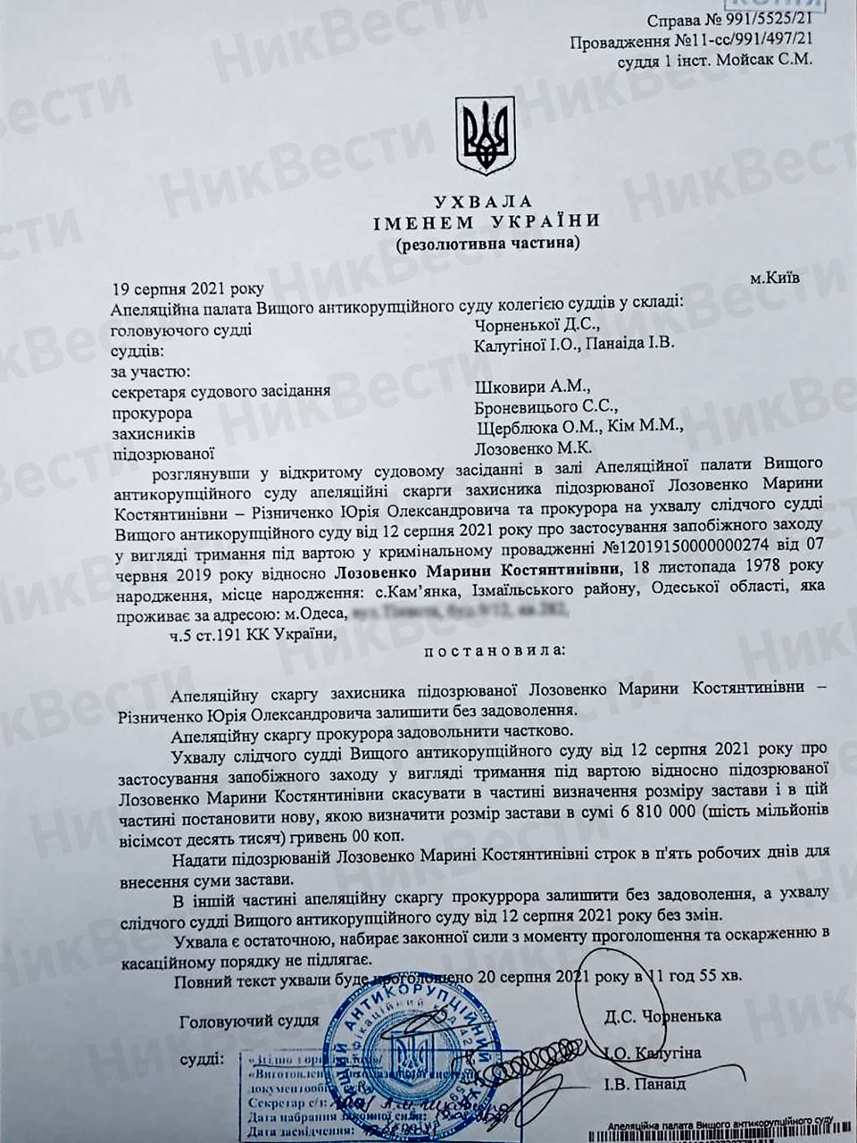 Апелляционная палата решила назначить Марине Лозовенко сумму залога в размере 6 миллионов 810 тысяч гривен. Ей дали 5 рабочих дней для внесения залога. Если она этого не сделает, снова отправится в СИЗО.