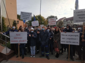 Сегодня, 12 октября, в Николаеве под Апелляционным судом на митинг в защиту НГЗ вышли несколько сотен работников завода. В руках они держали плакаты «Кто накормит наших детей?», «Мы не агрессоры, мы — украинцы и нам нужно жить», «Нам нужна работа», «Закрытие НГЗ — умышленно спланированная акция».